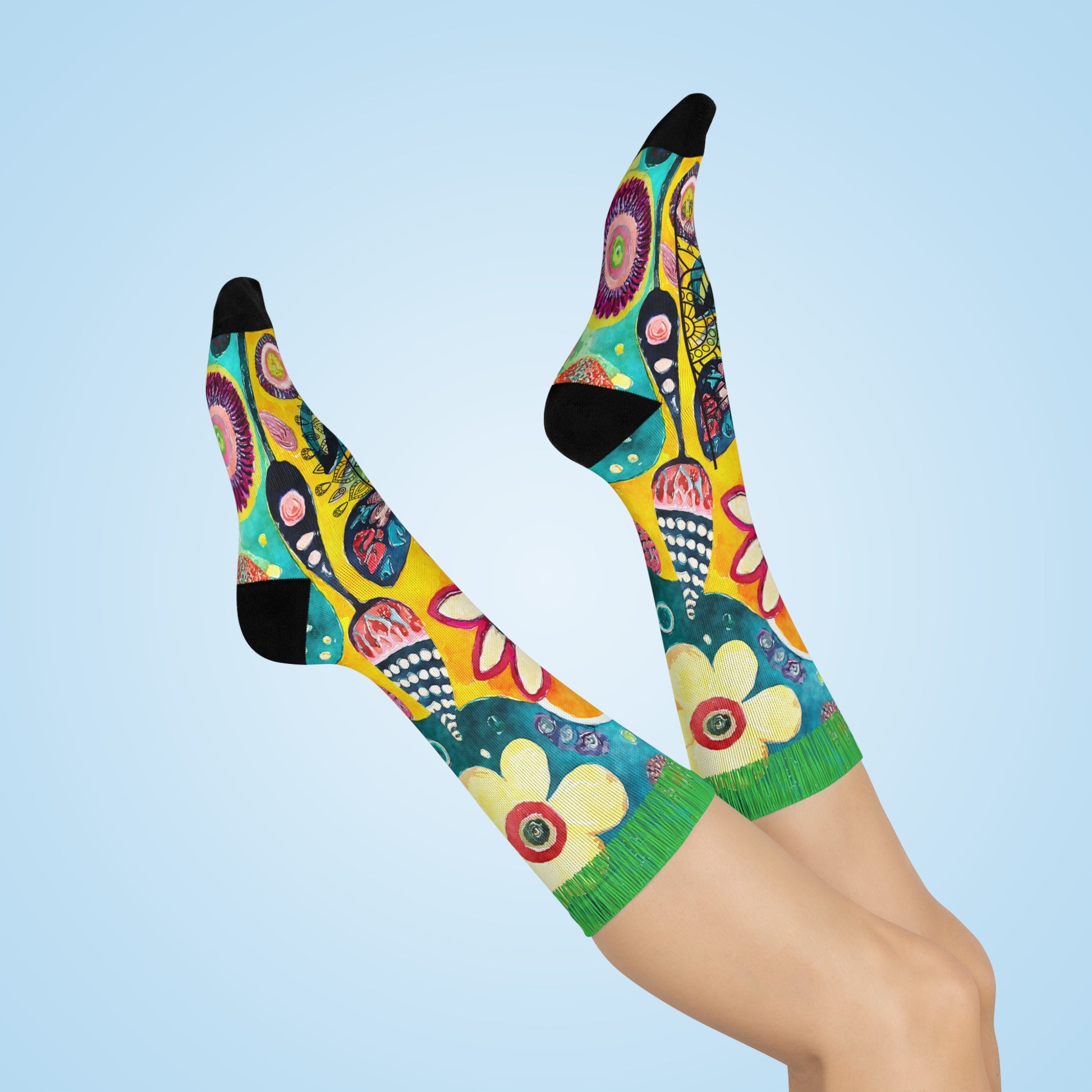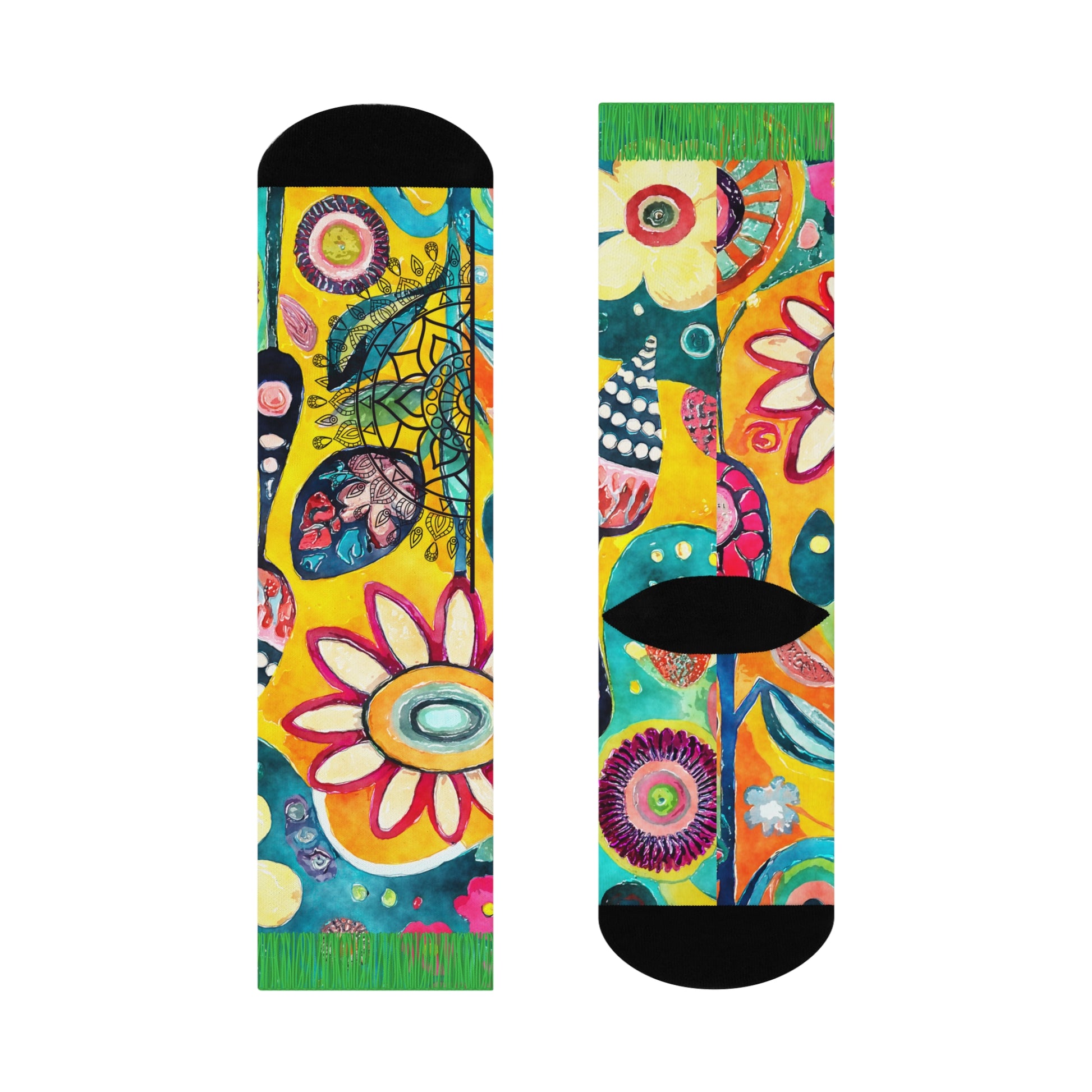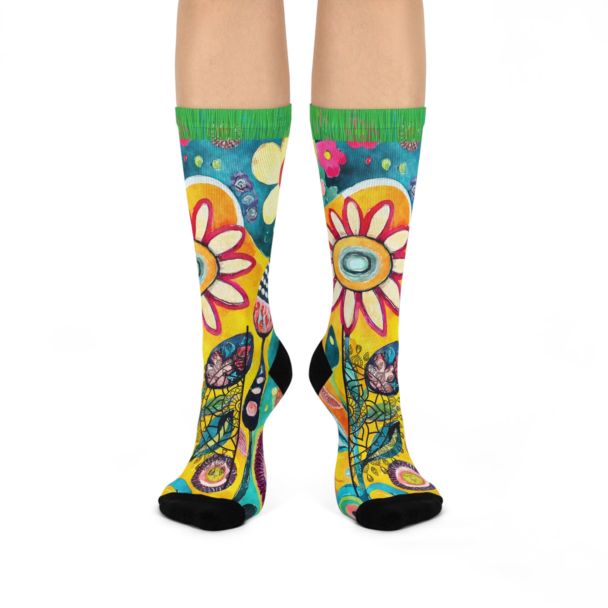These cushioned DTG crew socks are a one-size style designed with both function and appearance in mind. With the fully cushioned heel-to-toe, these socks provide superior comfort, while the DTG print process allows for ultra-crisp, crease-free printing. Composed of 73% polyester, 18% nylon, 6% spandex, and 3% cotton, these socks are an elevated alternative to the typical sublimation sock and provide a clean, comfortable base for your all-over print designs.