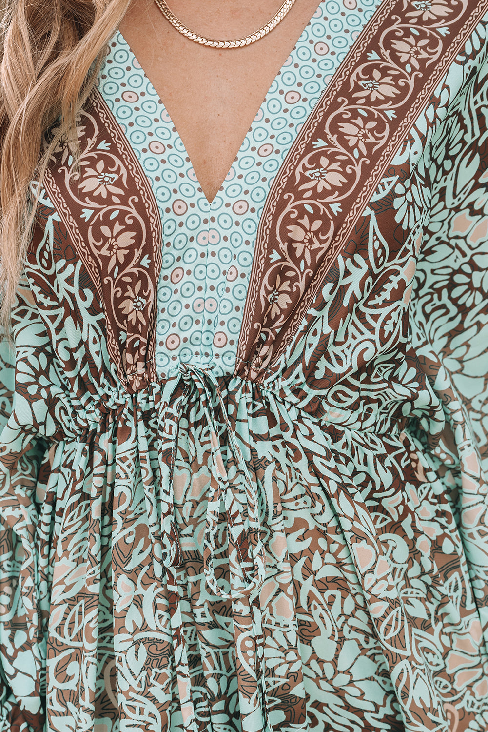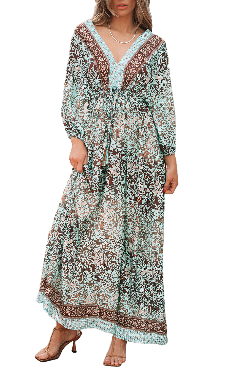 Green Boho Floral Print Lace-up Open Back High Waist Maxi Dress