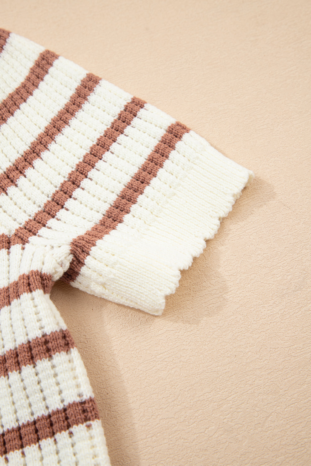 Khaki Stripe Scalloped Round Neck Short Sleeve Sweater