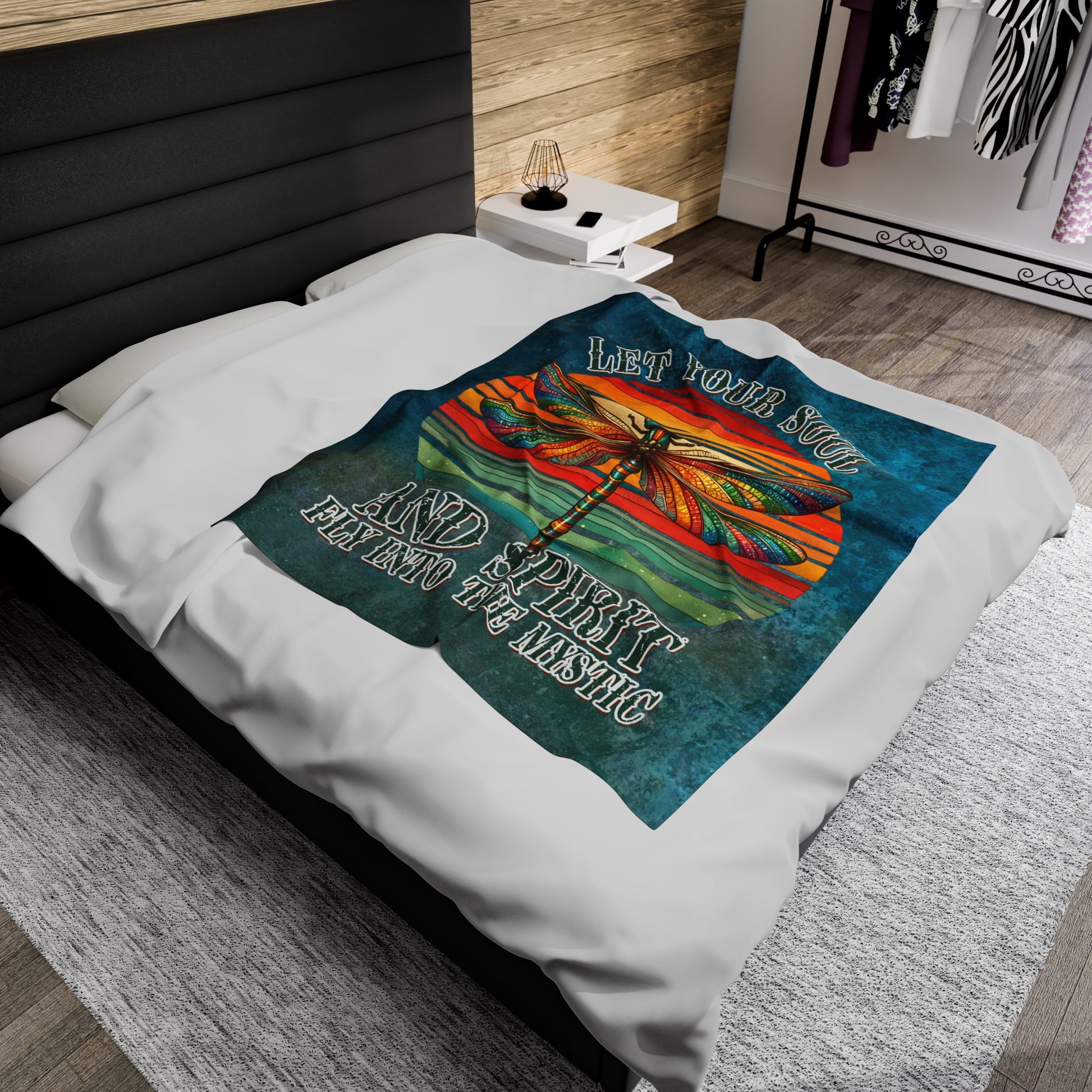 Let your soul and spirit fly into the mystic with this colorful dragonfly blanket. The vibrant design adds a touch of whimsy and magic to any room, making it perfect for those who appreciate nature and art. Ideal for cozying up on chilly evenings or as a decorative piece in a bohemian-inspired space. Great for nature lovers, artists, and those who celebrate creativity and free-spirited living.