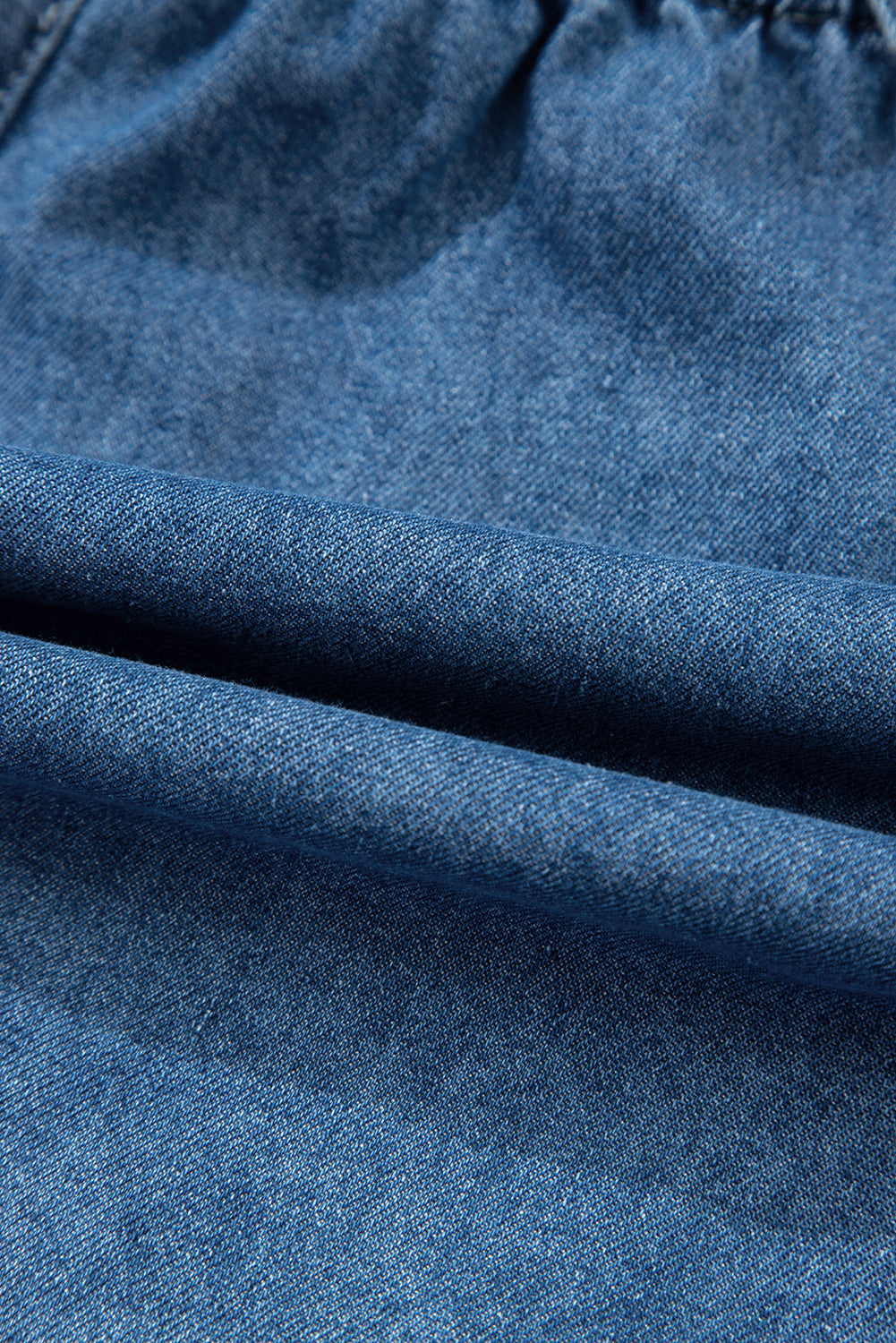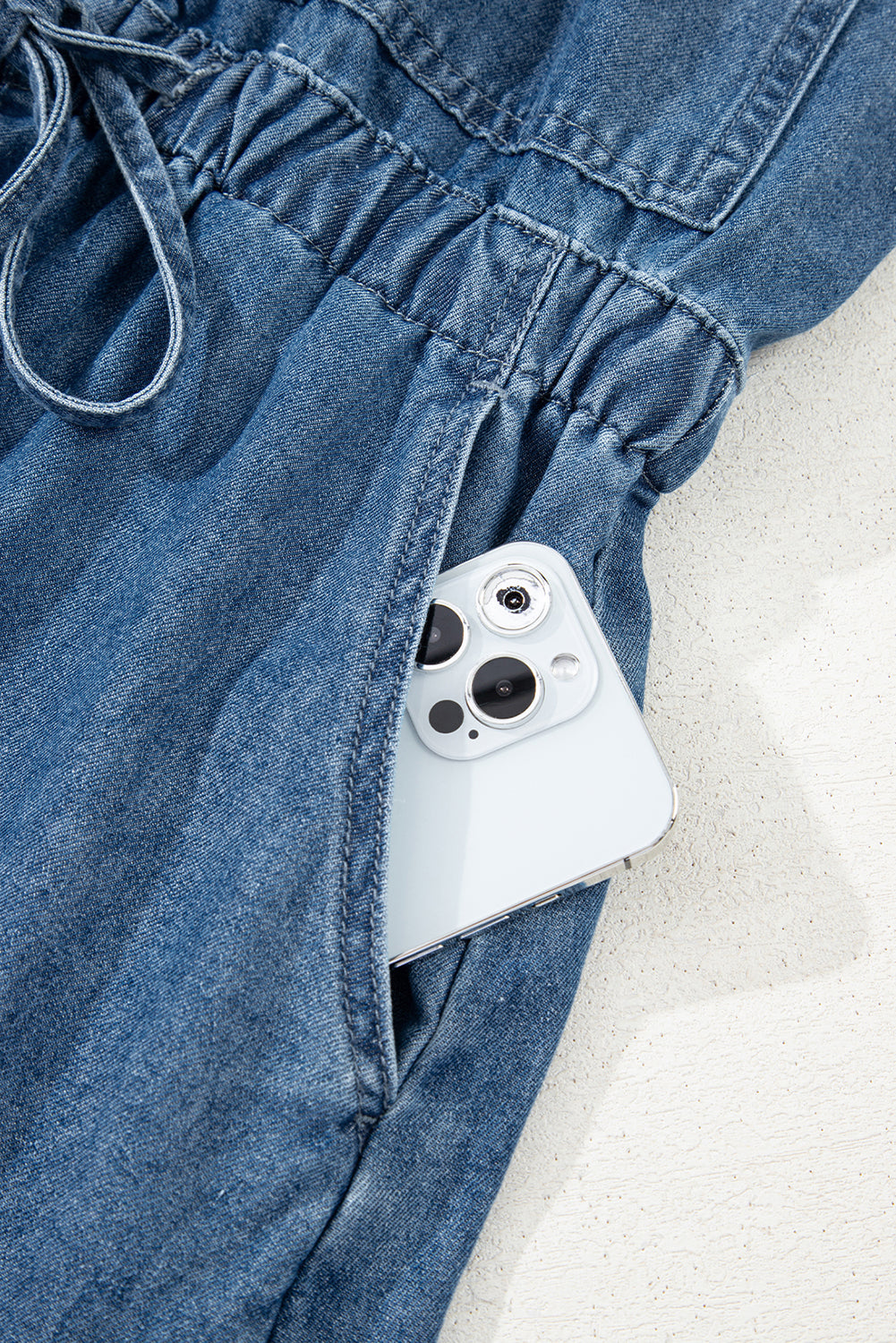 Sky Blue Buckle Straps Bib Style Drawstring Tied Backless Flared Denim Romper