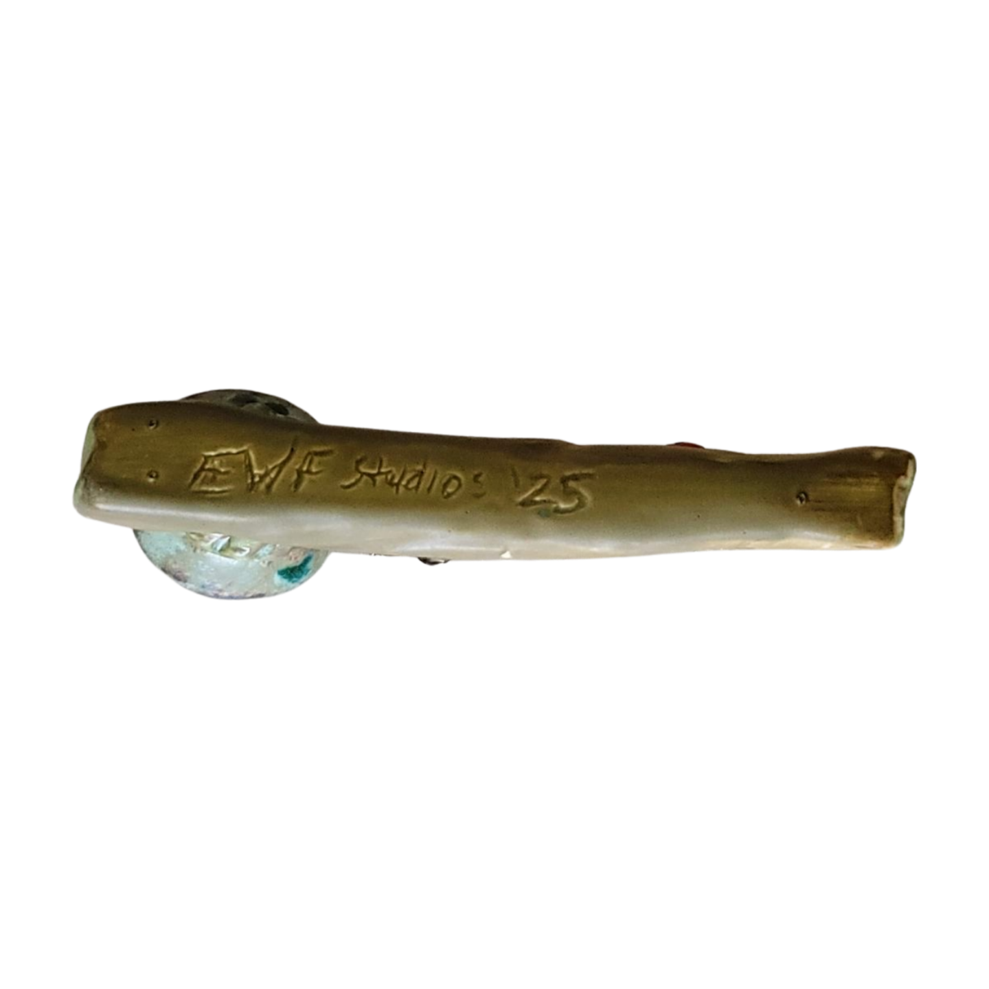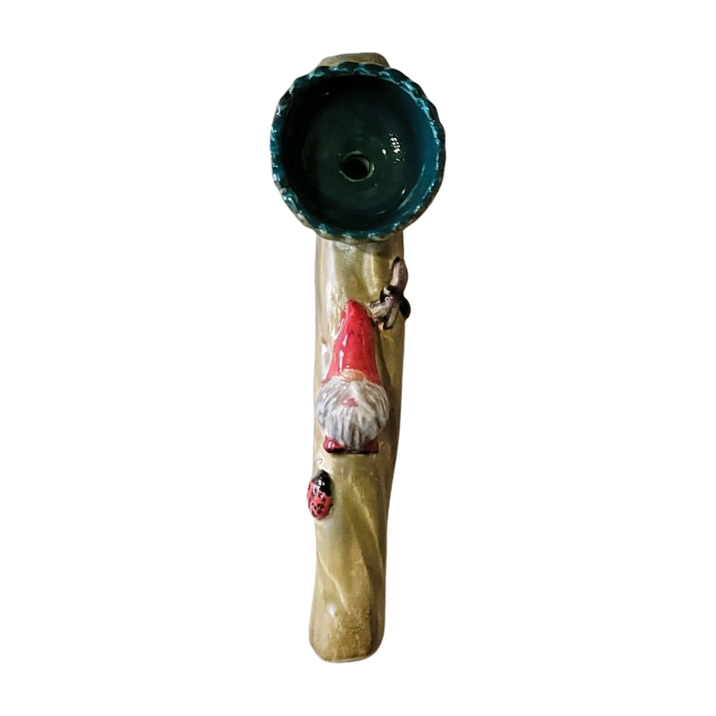 Channel your inner gnome with the Totem Gnome Pipe. This 5" ceramic pipe is hand built with a sculpted branch and adorned with a whimsical gnome, dragonfly, and ladybug. Enjoy deep hits with the 1.25" bowl depth. Let this pipe be your guide on a serene smoking journey.